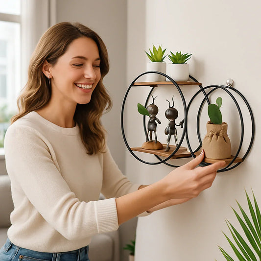 Pour les amateurs de formes rondes, l'étagère murale décorative RoomRack™ avec son design circulaire en bois et métal est parfaite pour créer un point focal dans votre pièce.